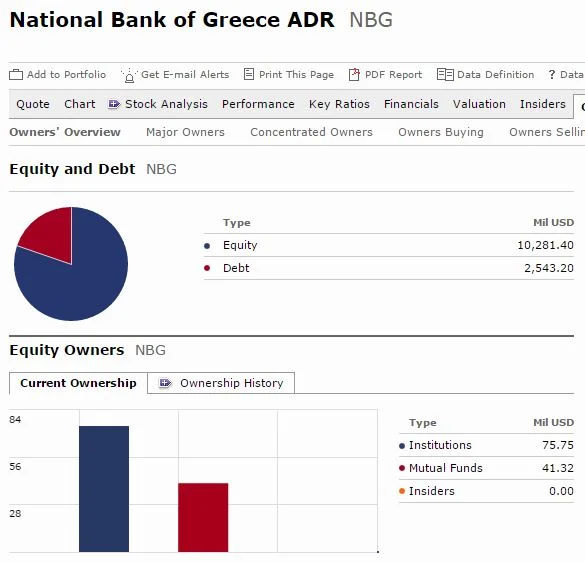 Кликнете в секцията Equity Ownership NBG върху Institutions и ще видите топ 10 на корпоративните фондове, собственици на NBG. Потърсете в гугъл инфо за тях. Познайте колко гръцко сиртаки има в тях и колко кънтри... wink emoticon