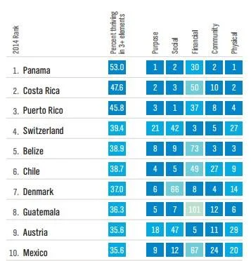 Панама предлага най-добро благосъстояние в света. За втора поредна година страната оглави съвместната класация на #Healthways и Gallup - Country Well-Being Rankings Report 2014. Проучването оценява благосъстоянието на страните по света по пет основни критерия: физическо благосъстояние, финансово благосъстояние, социално благосъстояние, обществено благосъстояние и свобода на избора.